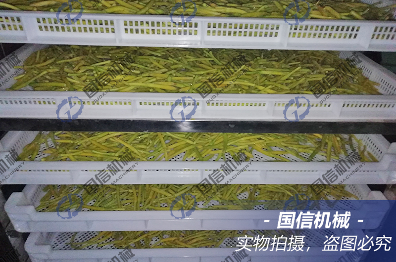 大型黃花菜烘干房內(nèi)部可以放置15個推車,共360個托盤,日烘干處理鮮黃花菜片5噸左右。