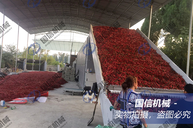 這種大型辣椒烘干機是采用多層網(wǎng)帶【一般為4層,也根據(jù)客戶需求進行定制】在烘箱內(nèi)呈“S”型運動,帶動辣椒在烘箱不停的運動,從上層網(wǎng)帶掉落至下層網(wǎng)帶,熱空氣從最下層進入烘箱,逐層穿透網(wǎng)帶和辣椒,最終從烘箱的上方將濕氣帶出烘箱,達到辣椒最終烘干的過程。熱空氣在烘箱內(nèi)與辣椒接觸的時間極短,不會影響到辣椒的顏色問題。因為是連續(xù)式烘干,所以烘干產(chǎn)量比較大,適用于較大產(chǎn)量的辣椒烘干作業(yè),烘干速度快,生產(chǎn)效率高,受到了市場的一致肯定與歡迎。