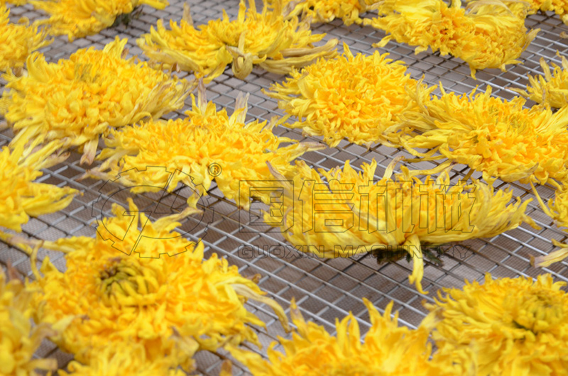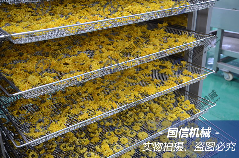 (部分菊花需要殺青階段:設(shè)置溫度65℃~70℃,時長2~3小時,如果需要,可以在進料前在鮮菊花上噴灑少量清水,殺青效果更好。)