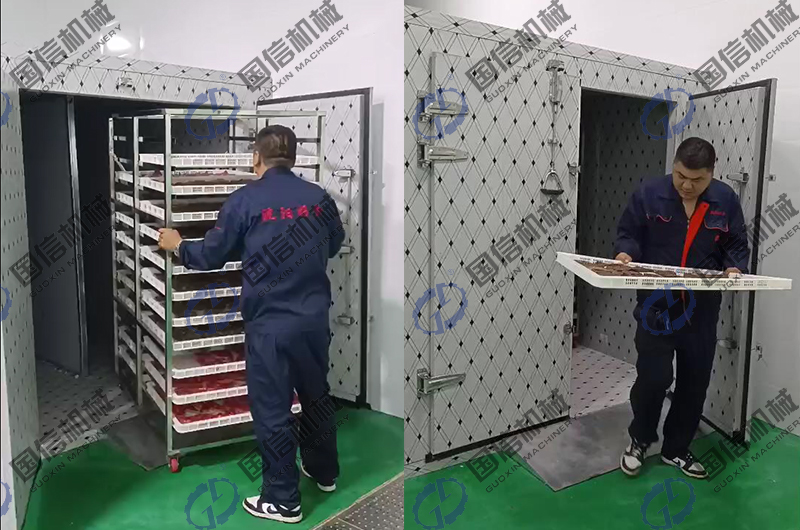 - 烘干:將腌制好的牛肉條,均勻一致的懸掛在烘干房內(nèi)進(jìn)行烘干,烘干房的熱風(fēng)循環(huán)系統(tǒng)和排濕系統(tǒng),可以提高烘干效率,精準(zhǔn)控溫控濕的智能化操控模式可以使牛肉烘干房的烘干模式接近自然風(fēng)干,保證牛肉干肉質(zhì)鮮美。
